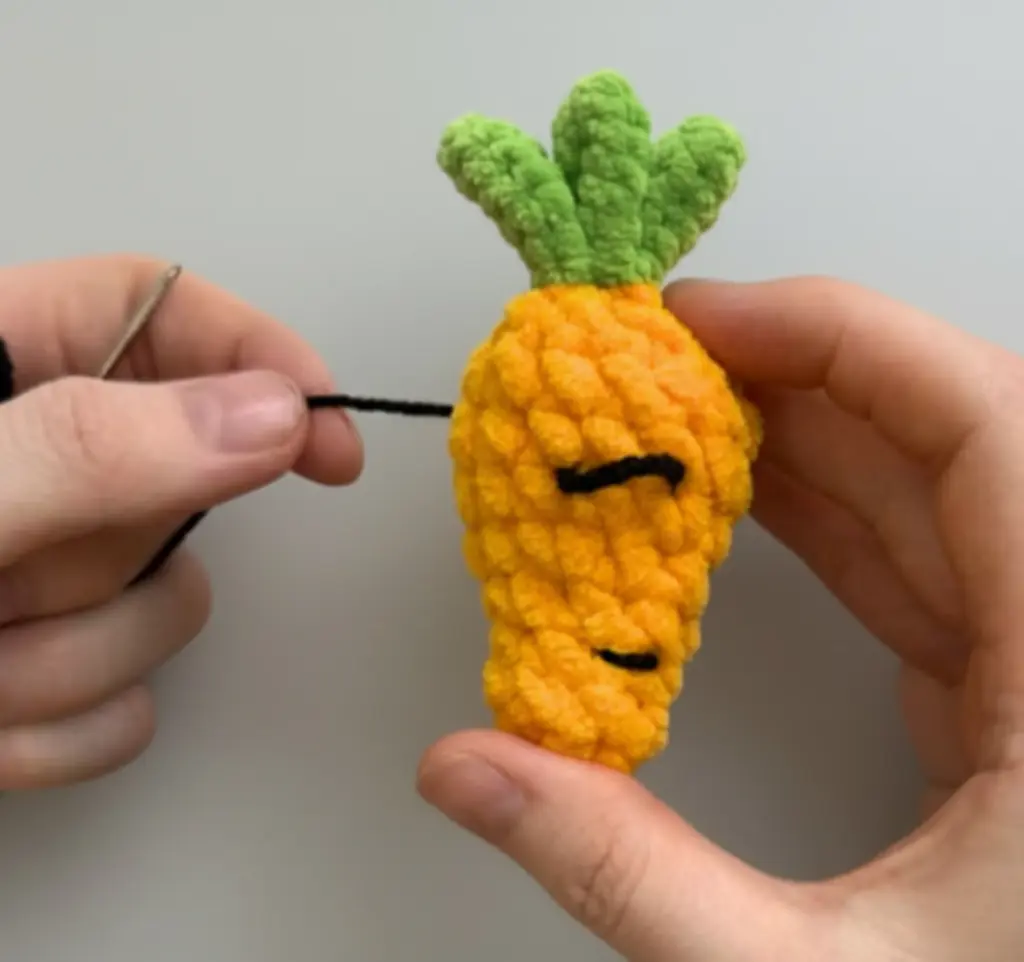 - Using your yarn needle and black cotton yarn, embroider small horizontal or diagonal strips onto the orange body of the carrot. These simple lines add character and detail.