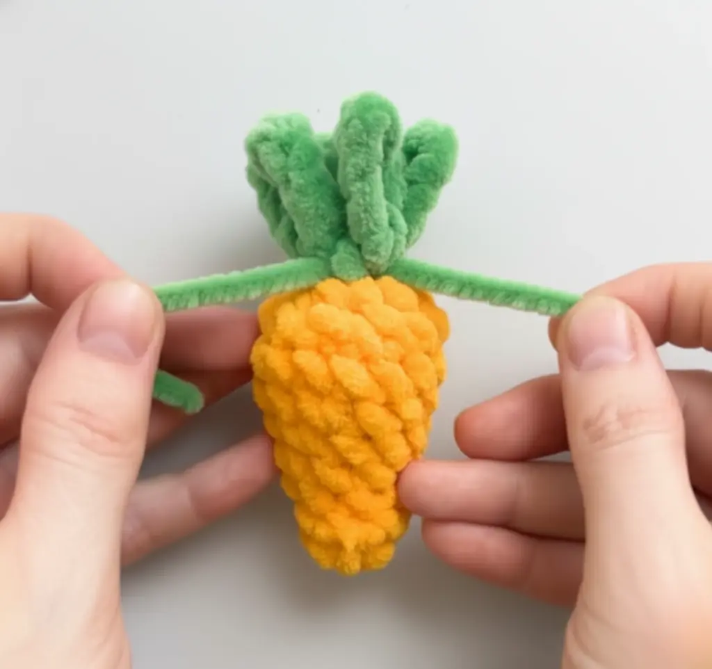 - Finish stuffing your carrot firmly. Cut the yarn, fasten off, close the remaining hole, and weave in the loose end.