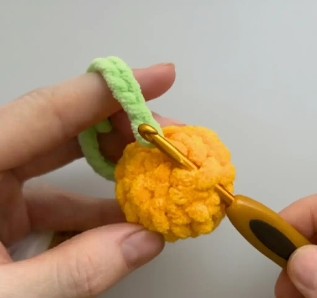 - Take your green yarn and join it to the top of the carrot using a slip stitch.
