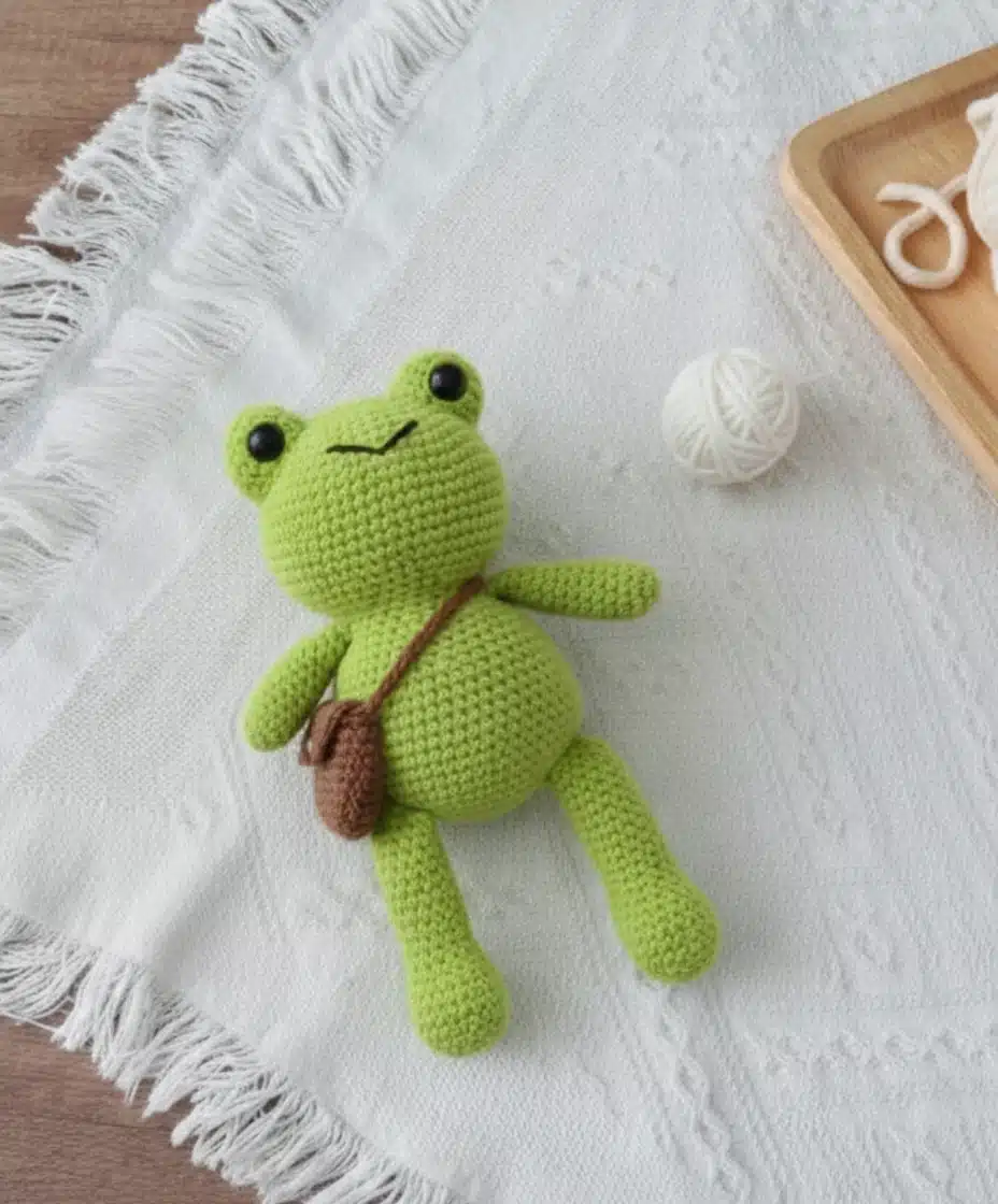 What makes this amigurumi frog extra special is the tiny bag accessory—perfect for carrying small treasures or simply adding charm.