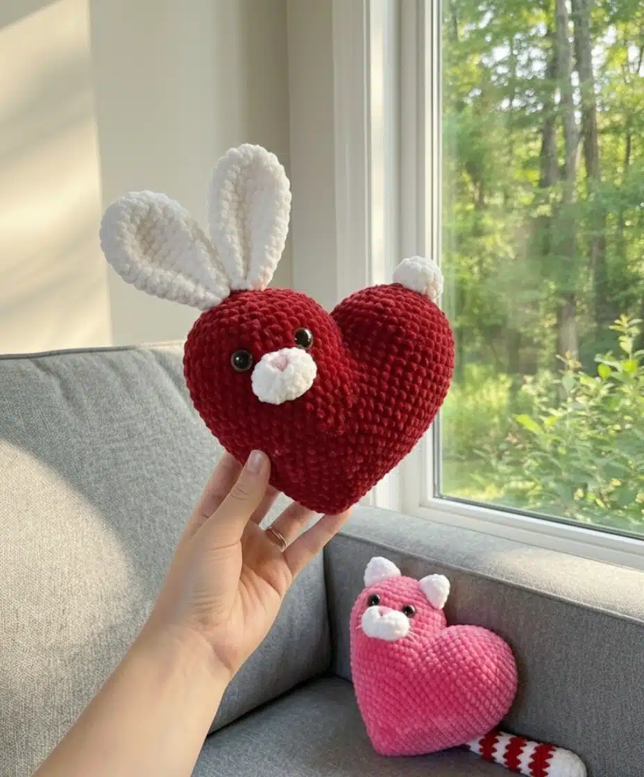 Your heart-shaped companion is now complete and ready to spread joy! Whether you chose the sweet bunny or the playful cat, you’ve created something truly special. The beauty of this valentine heart amigurumi bunny pattern is its versatility make one of each, or create a whole family in different colors.