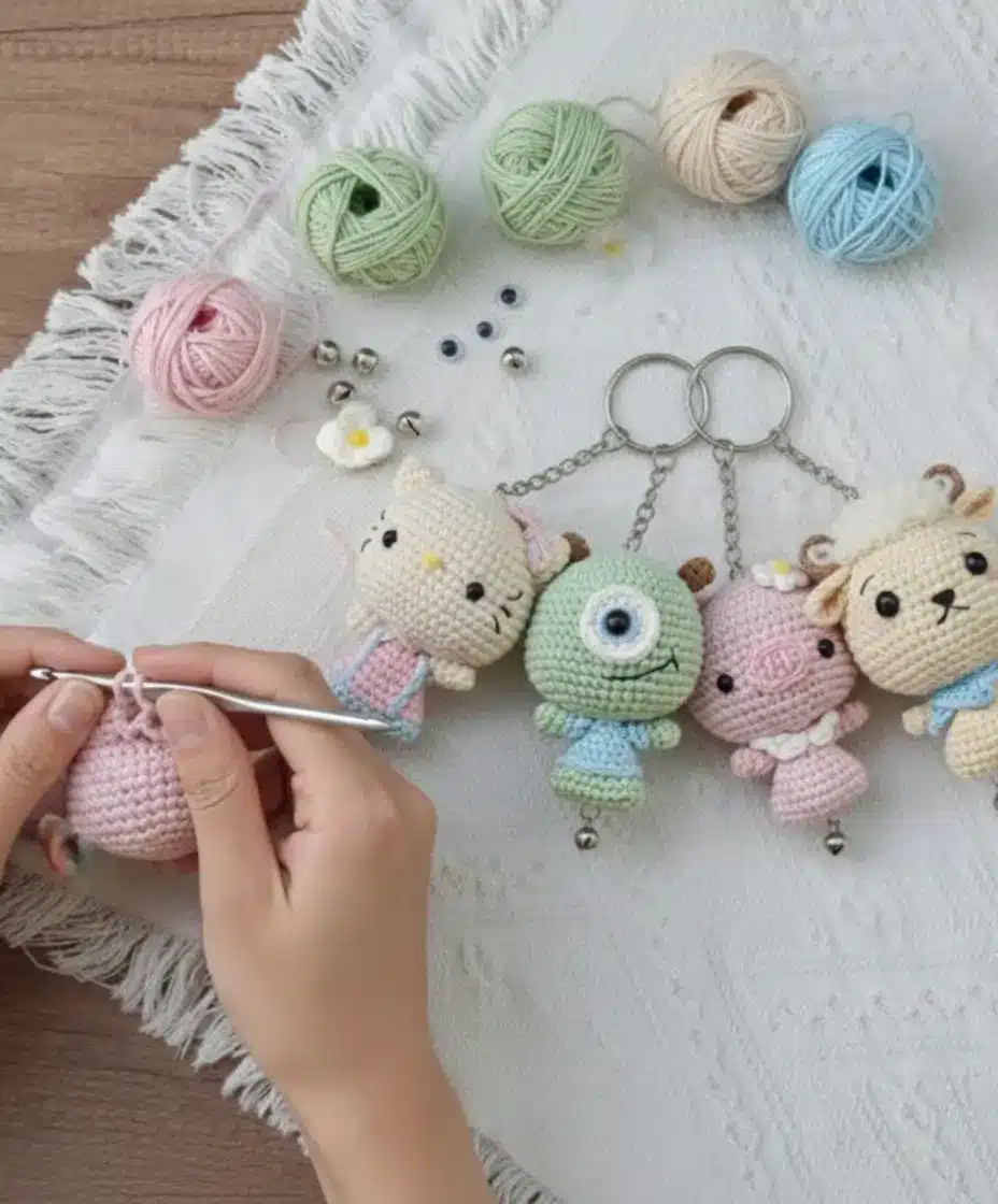 Tools: crochet hook (1 mm or 1.5 mm for the size), scissors, a light needle for stuffing, and a small glue gun if you prefer stronger attachment for the bell/key ring.