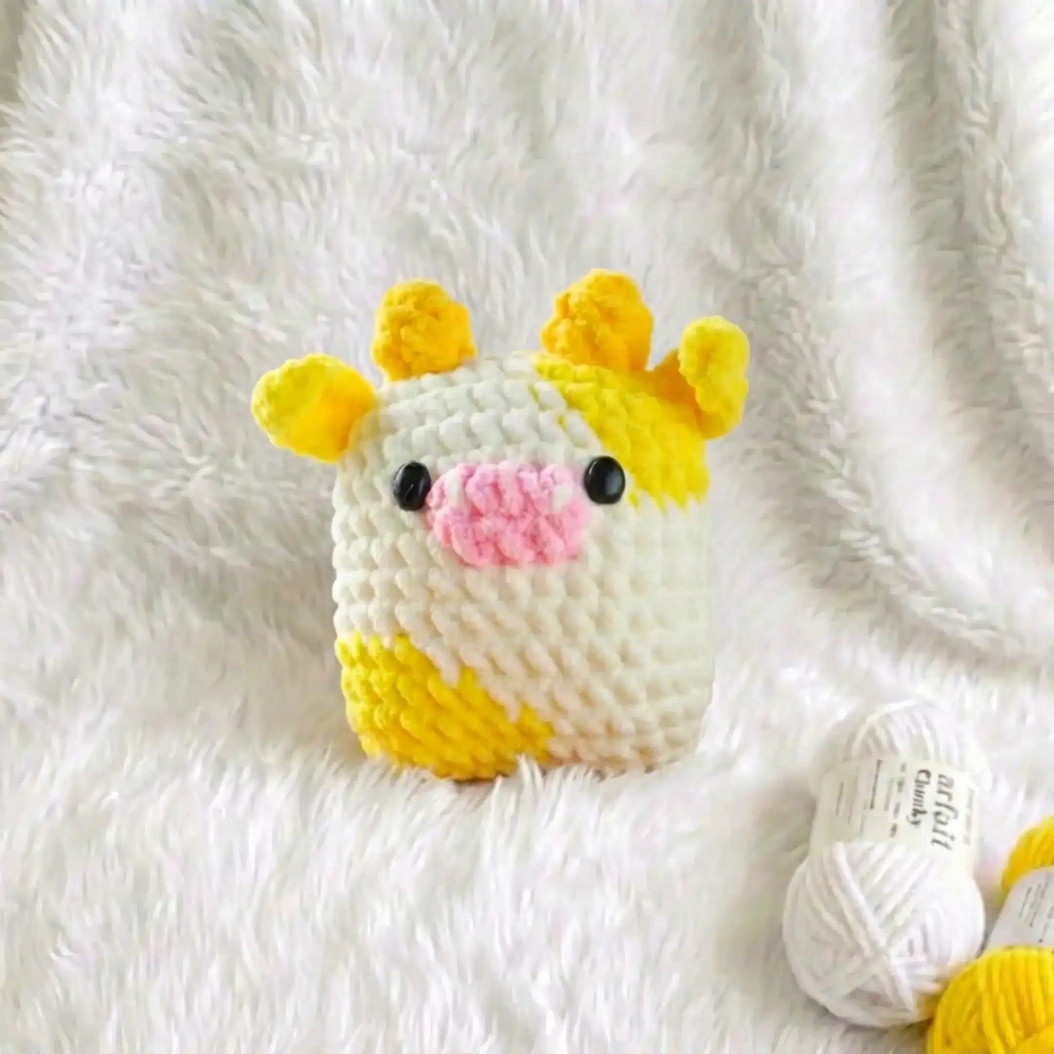While the patterns are designed for bulky/category 5 yarn, you can use different yarn weights with an appropriately sized hook. Just note that your finished cow will be larger or smaller depending on your yarn choice. Always adjust your safety eye size accordingly to match your finished project size.